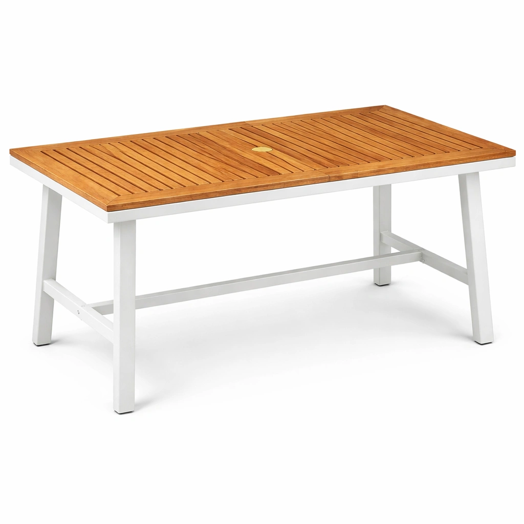 Der rechteckige Gartentisch verfügt über eine Tischplatte aus Teakholz und einen Rahmen aus Aluminium.